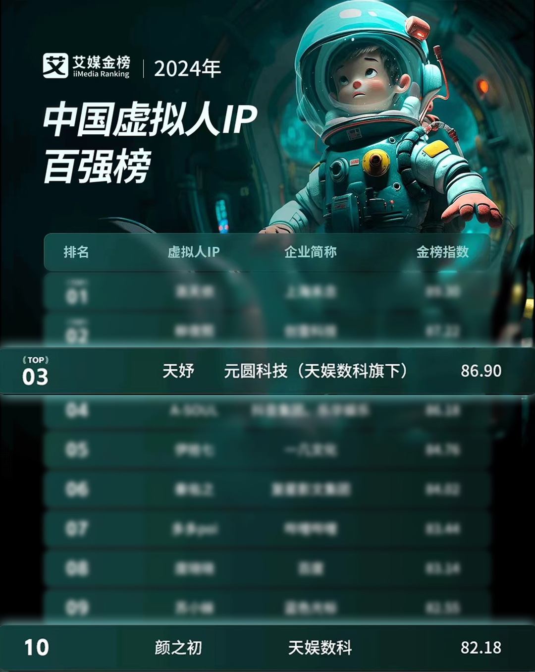 日前,全球新經(jīng)濟產(chǎn)業(yè)第三方數(shù)據(jù)挖掘和分析機構(gòu)iiMedia Research(艾媒咨詢)發(fā)布《2024年中國虛擬人IP百強榜》,天娛數(shù)科子公司元圓科技旗下虛擬數(shù)字人天妤、顏之初雙雙進入榜單To