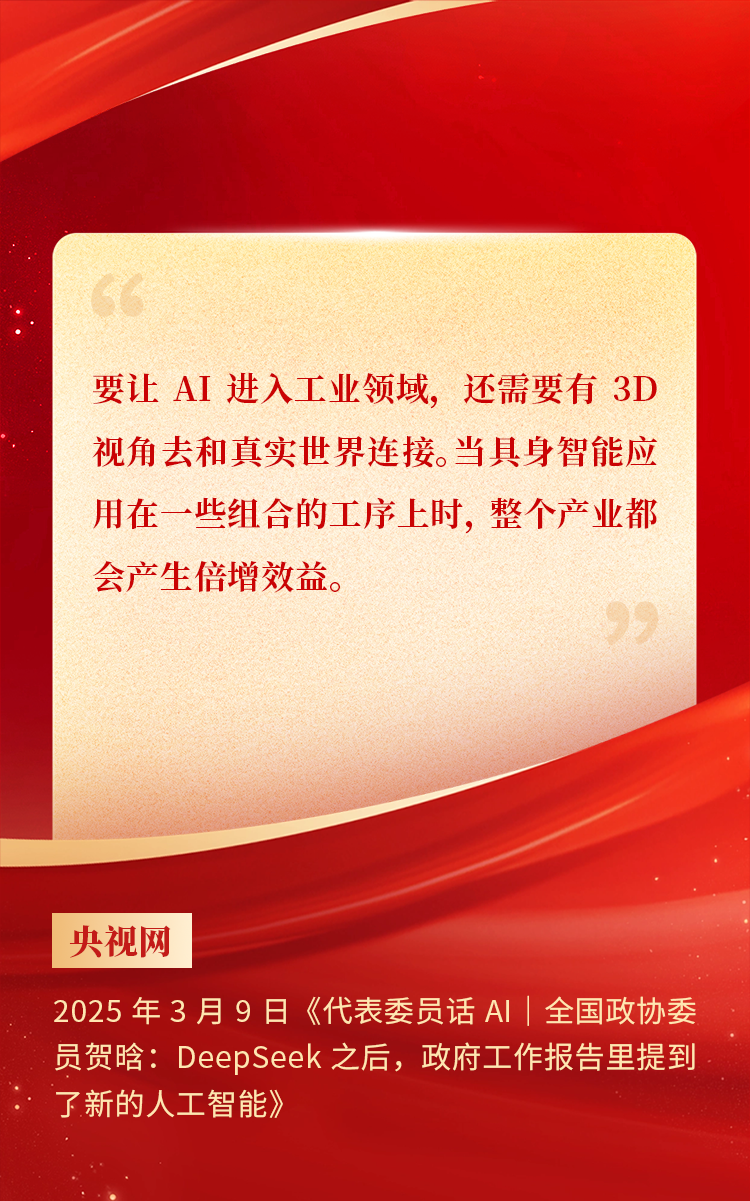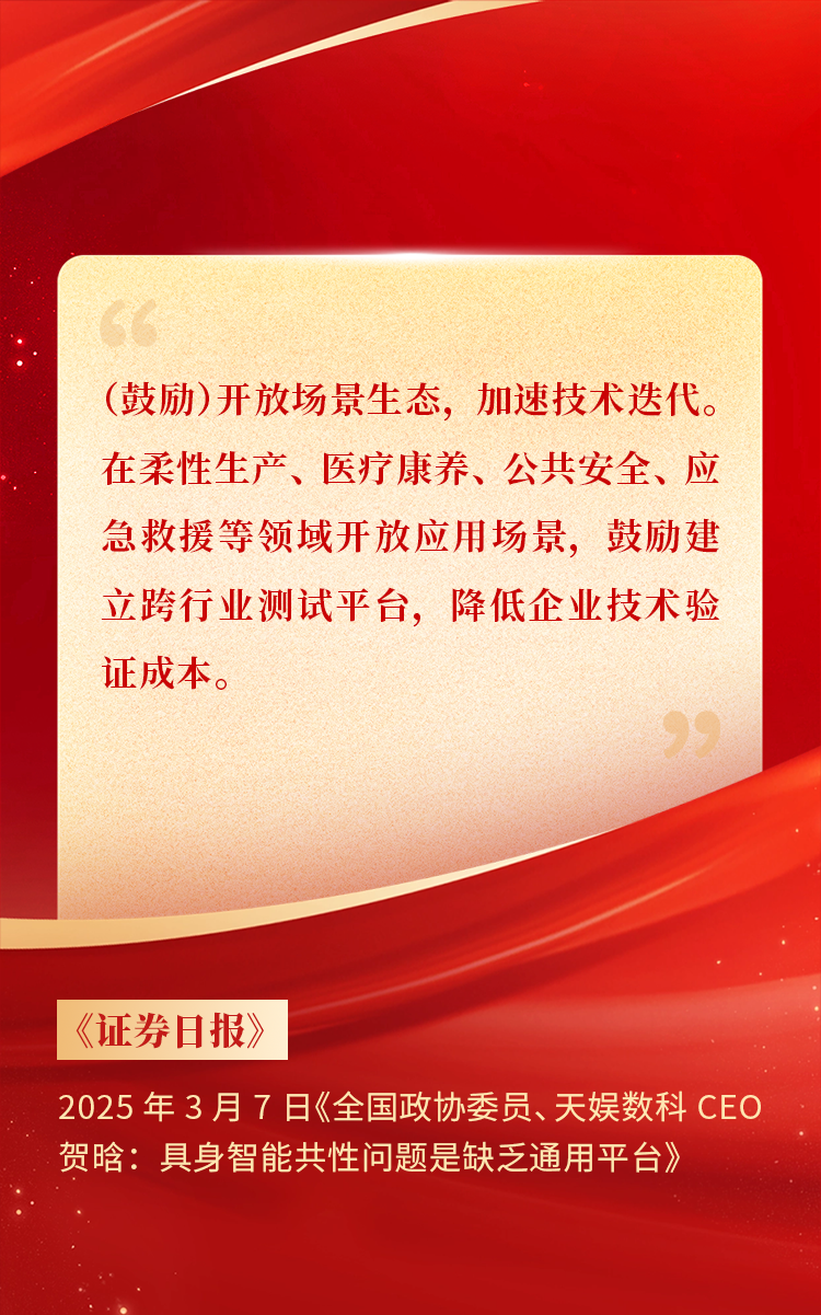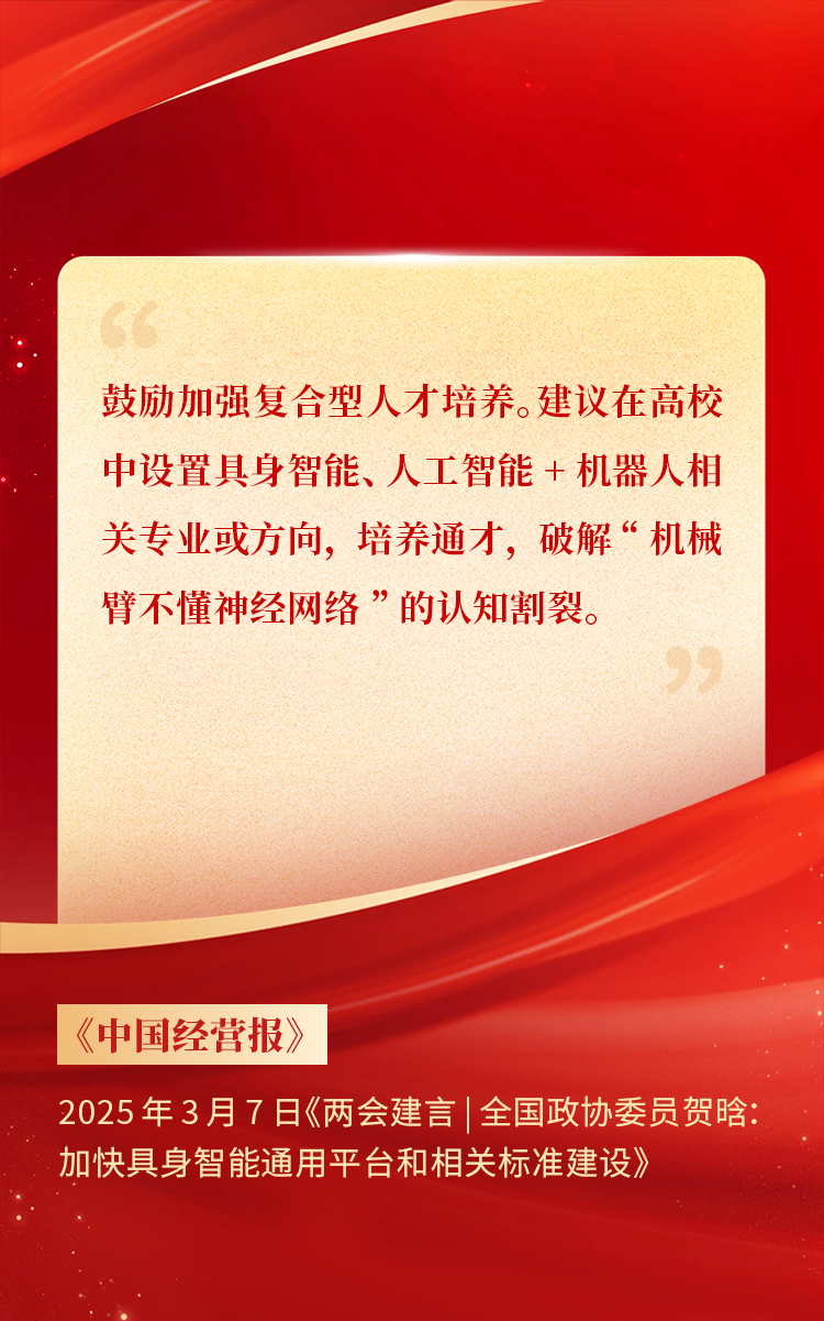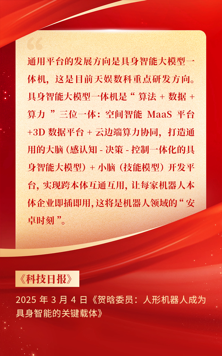 全國(guó)政協(xié)委員、天娛數(shù)科CEO賀晗連續(xù)第三年上會(huì)履職,圍繞“具身智能”“人形機(jī)器人”“人工智能產(chǎn)業(yè)”等熱詞積極建言,受到了媒體的廣泛關(guān)注,吸引了來自央視網(wǎng)、經(jīng)濟(jì)參考報(bào)、中國(guó)電子報(bào)、第一財(cái)經(jīng)日?qǐng)?bào)等央黨媒體、主流財(cái)經(jīng)等媒體記者的專訪報(bào)道,讓我們一起回顧賀晗委員兩會(huì)建言!